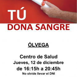 CAMPAÑA DE DONACIÓN DE SANGRE Fecha: Jueves 16 de Diciembre. Hora: 16:15h a 20:45h Lugar: Centro Salud de Ólvega No olvide llevar el DNI. Galería de Imágenes Comparte esta Página