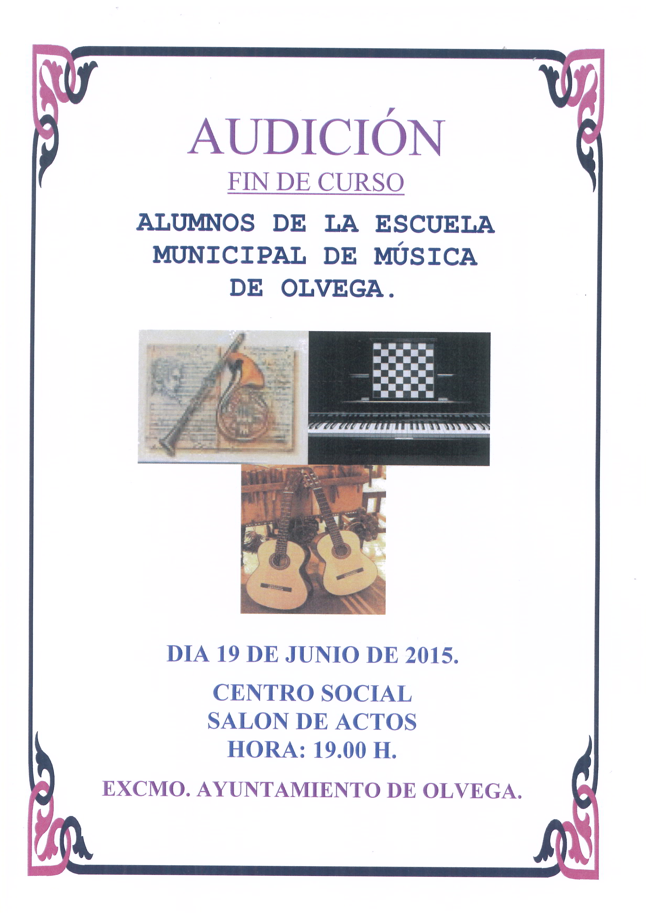 El viernes 19 de junio, a las 19:00 hs en el CSO, se celebrará la audición de fin de curso a cargo de los alumnos de la escuela de música de nuestra localidad. Ólvega 2015