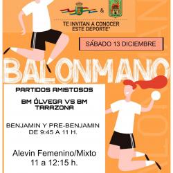 BM Ólvega vs BM Tarazona Fecha: Sábado 13 de Diciembre de 2025 Hora: 9:45h a 11:00h Benjamín y Pre-Benjamín 11:00h a 12:15h Alevín Femenino / Mixto Lugar: Polideportivo Municipal de Ólvega Galería de Imágenes Comparte esta Página