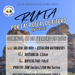 El domingo 15 de febrero el club Cima 2.000 organiza una ruta por las roscas de Fitero, un recorrido de 11 kilómetros, de fácil ejecución, y que tiene un precio de 20 euros para los socios y de 25 euros para los nos socios. En esta cuota viene incluido el autobús y la comida en un restaurante de la zona.