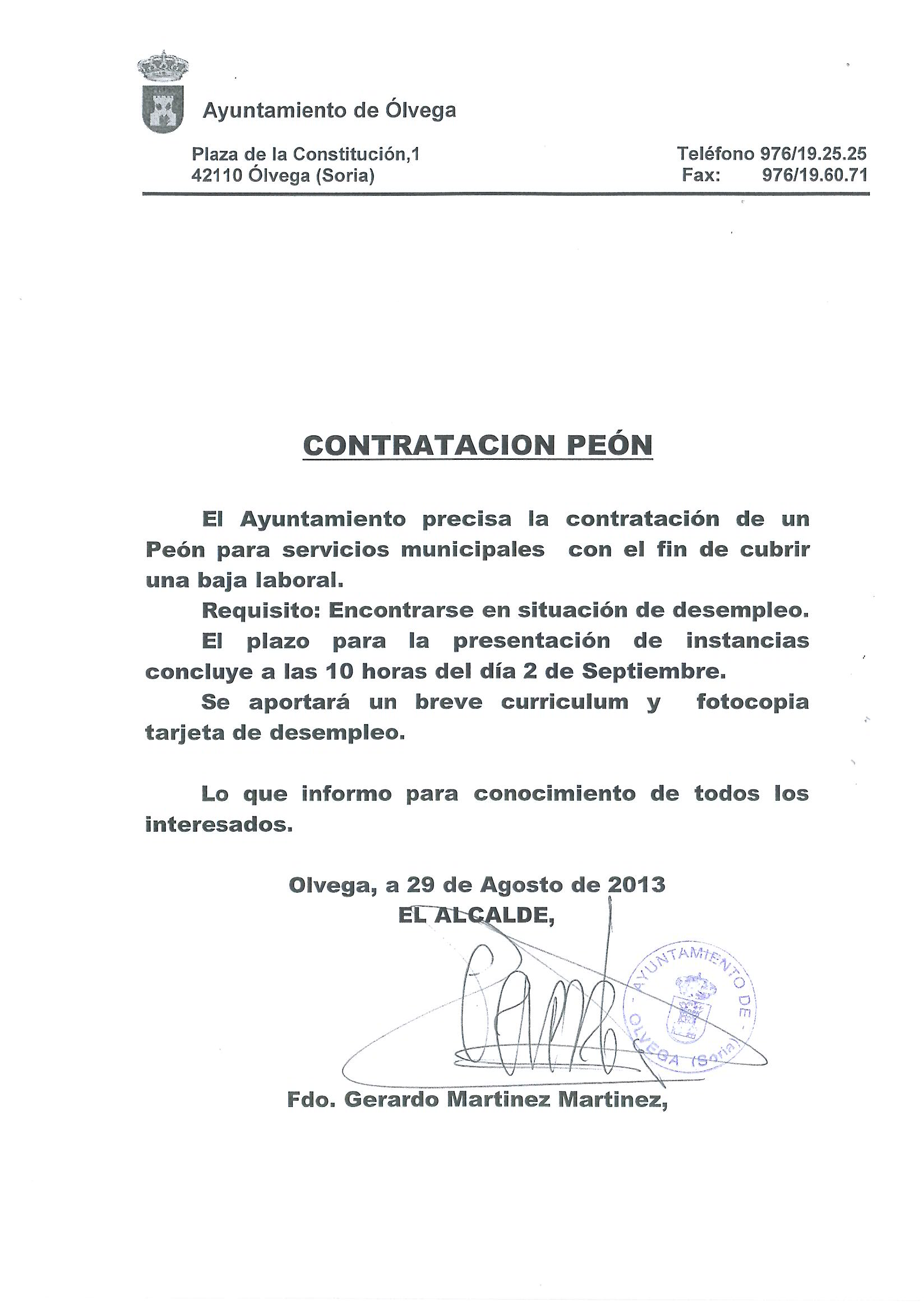 El Ayuntamiento necesita contratar un peón de usos múltiples. Plazo de presentación de solicitudes hasta las 10:00 h. del día 2 de septiembre de 2013 Ayuntamiento de Ólvega- Empleo Descargas Contratación peón (256.57 KB) Comparte esta Página