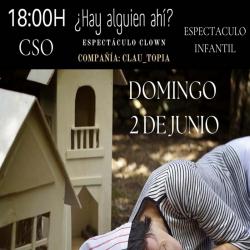 El domingo 2 de junio a las 18:00 horas en el Centro Social, la compañía Clau_topia representará el espectáculo "¿Hay alguien ahí?, un relato que ofrece humor, poesía, viaje, música, celebración y ¡mucho más!
