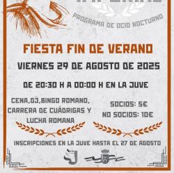 Fecha: Viernes 29 de Agosto de 2025 Hora: De 20:30h a 00:00h Lugar: La Juve Cena, Dj Bingo, Romano, Carrera de Cuádrigas y Lucha Romana. Socios: 5euros No Socios: 10euros INSCRIPCIONES EN LA JUVE HASTA EL 27 DE AGOSTO Galería de Imágenes Comparte esta Página
