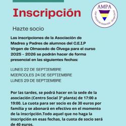 Hazte socio. Las inscripciones de la Asociación de Madres y Padres de alumnos de Ólvega para el curso 2025 - 2026 se podrán hacer de forma presencial en las siguientes fechas: