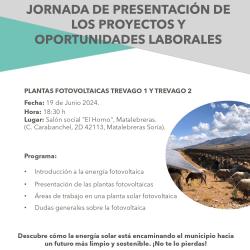 La empresa Alquila Clean Energy es la encargada de la presentación del proyecto de las placas fotovoltaicas Trévago 1 y Trévago 2. Tendrá lugar el miércoles 19 de junio a las 18:30 horas en el salón social "El Horno" de Matalebreras. Galería de Imágenes Comparte esta Página