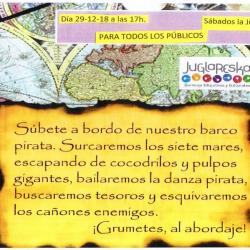 El sábado 29 de diciembre a partir de las 17:00 horas subete a bordo de nuestro barco pirata. Surcaremos los siete mares, escapando de cocodrilos y pulpos gigantes, bailaremos la danza pirata, buscaremos tesoros y esquivaremos los cañones enemigos.