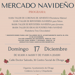 El domingo 17 de diciembre en el salón del centro social se celebrará el tradicional mercado navideño, en el que podremos adquirir una gran variedad de productos típicos de estas fechas.