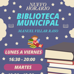 A partir del 1 de noviembre entrará en vigor los nuevos horarios de la biblioteca municipal. Serán los siguientes: - De lunes a viernes, de 16:30 a 20:00 horas. - Martes, de 10:30 a 13:30 y de 16:30 a 20:00 horas. Galería de Imágenes Comparte esta Página