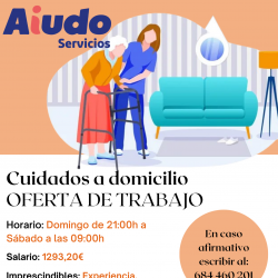 Se necesita persona para cuidados a domicilio, en horario desde el domingo a las 21:00 horas hasta el sábado a las 9:00 horas. Imprescindible tener experiencia, documentación en regla y referencias de antiguos empleos.