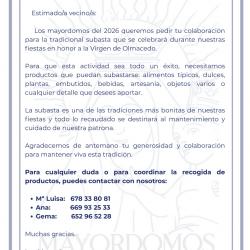 Los mayordomos del 2026 queremos pedir tu colaboración para la tradicional subasta que se celebrará durante nuestras fiestas en honor a la Virgen de Olmacedo.