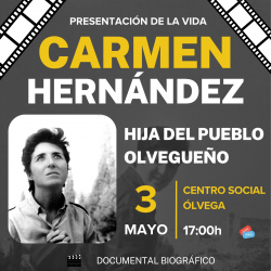 El sábado 3 de mayo a partir de las 17:00 horas en el Centro Social tendrá lugar la presentación de la presentación de la vida de Carmen Hernández, con un documental biográfico y con la venta de libros durante el acto.