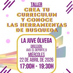 El miércoles 22 de abril, en horario de 17:00 a 19:30 horas en La Juve, se impartirá un taller en el que se podrá aprender a crear un currículum y a conocer las diferentes herramientas de búsqueda.