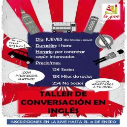 DÍA: JUEVES. DURACIÓN: 1 HORA. HORARIO: Por concretar según interesados. PRECIO/MES: 12 € socios. 13€ hijos de socios. 25 € no socios. ¡¡¡ Con profesor nativo y grupos adaptados a tu nivel !!! INSCRIPCIONES EN LA JUVE HASTA EL 31 DE ENERO. Galería de Imágenes Comparte esta Página