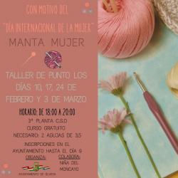 Con motivo del Día Internacional de la Mujer, el Ayuntamiento y la asociación Niñas del Moncayo han organizado un taller de punto denominado "Manta Mujer" los días 10, 17 y 24 de febrero y el 3 de marzo, de 18:00 a 20:00 horas en la 3ª planta del Centro Social.