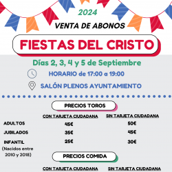 Los días 2, 3, 4 y 5 de septiembre se podrán comprar en el salón de plenos del Ayuntamiento, en horario de 17:00 a 19:00 horas, los bonos para las Fiestas del Cristo tanto de los festejos taurinos como de la comida popular. Galería de Imágenes Comparte esta Página