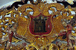 Llegados aquí, queremos destacar que descubrimos en la parte alta de este retablo el escudo más antiguo de la villa –del siglo XVIII-, que es además el único del pasado que se conserva. Campea en el ático sobre un águila imperial bicéfala de buen dorado. Es un escudo español del tipo de piel de toro, con una torre donjonada en todo su campo, rodeada de altas llamas exteriores.