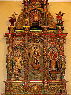 Es de estructura y decoración barrocas, con sus típicos estepitas y sus columnas salomónicas. La escultura del Arcángel, en actitud de guerrero defensor de los derechos de Dios, está finamente tallada y policromada, pero sin duda es anterior al retablo.