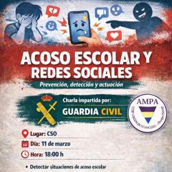 El miércoles 11 de marzo a partir de las 18:00 horas en el Centro Social tendrá lugar una charla impartida por la Guardia Civil acerca del acoso escolar y redes sociales: prevención, detección y actuación.