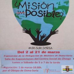 El domingo 1 de marzo a las 17:00 horas en el Centro Social de nuestra localidad, el obispo de nuestra diócesis inaugurará la exposición de la Delegación de misiones de Osma - Soria titulada ¿Misión Imposible?. Esta muestra se extenderá hasta el 21 de marzo y el horario para visitarla será de 17:00 a 19:00 horas. Nos contará mediantes imágenes, vídeos y obras de arte la labor que están haciendo nuestros misioneros en diferentes lugares del mundo.